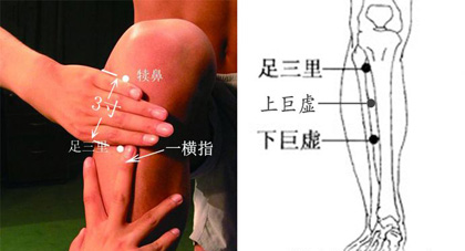 在膝盖下外侧,约四横指(约3寸)的小腿胫骨外侧有一凹沟处,这是强壮穴,力度按大一点,酸麻的经络传感可到脚背。按摩本穴可治一切肠胃消化系统疾病,包括消化不良、胃胀胃痛。