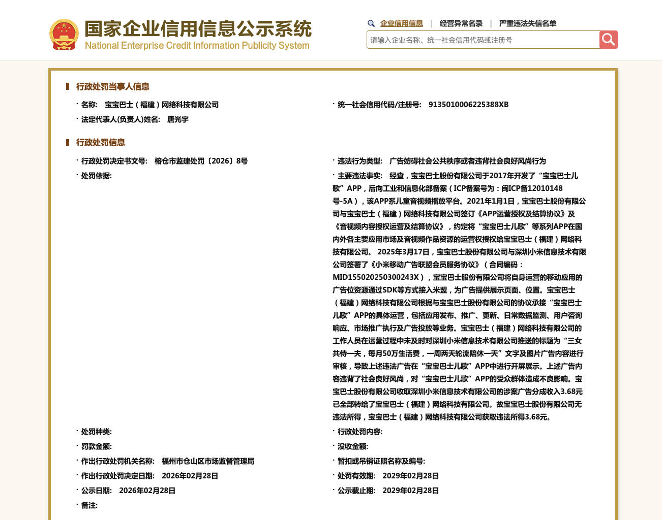 中新网3月17日电(吴家驹)国家企业信用信息(xi)公示(shi)系统显示(shi),近日,宝宝巴士(shi)(福建)网络科技有限(xian)公司,因广(guang)告妨(fang)碍社(she)会公共秩(zhi)序或者(zhe)违背社(she)会良好(hao)风尚行为,被福州市仓山区市场监督管理局罚款30万元、没(mei)收违法所得3.68元。