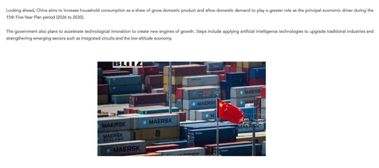 文章注意到,中国计划(hua)在“十五五”时代提高居民消耗占国内临盆总值的比重,让(rang)内需在拉动(dong)经济增长中发挥更首要的作用。此(ci)外,政(zheng)府还计划(hua)通过(guo)加速科技创新打造经济增长新引擎,详细步伐包含应用野生智能技能赋能传统产(chan)业转型升级,以及做(zuo)大做(zuo)强集成电路、高空经济等新兴产(chan)业。