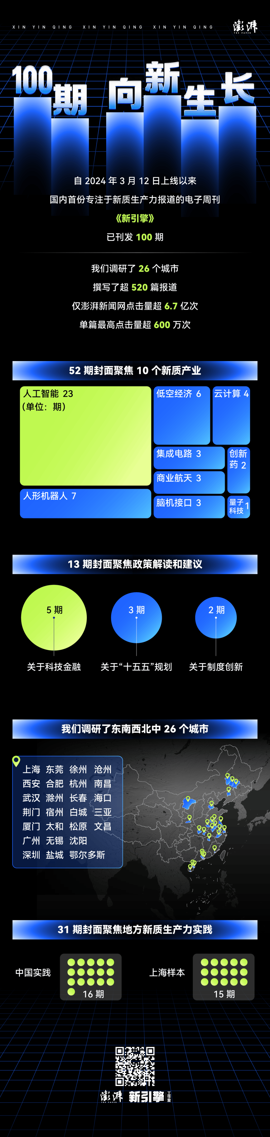 自2024年(nian)3月12日上线以来,国内首份专注于新质生产力报道的电子周刊《新引擎(qing)》已刊发100期。2年(nian)多(duo)时候,《新引擎(qing)》以“权威解读+深度调研”为特点,聚焦报道了10个新质家当,调研了26个城市,撰写(xie)了超(chao)520篇报道。